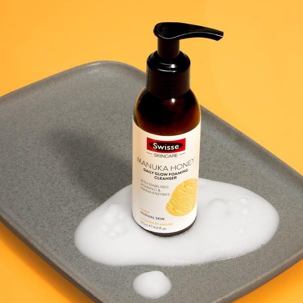 Rise and shine with Swisse Manuka Honey Daily Glow Foaming Cleanser featuring stabilised Vitamin C and Papaya Enzymes. This refreshing and radiance-boosting cleanser delivers intense moisture and a gentle clean for soft, dewy and glowing skin.